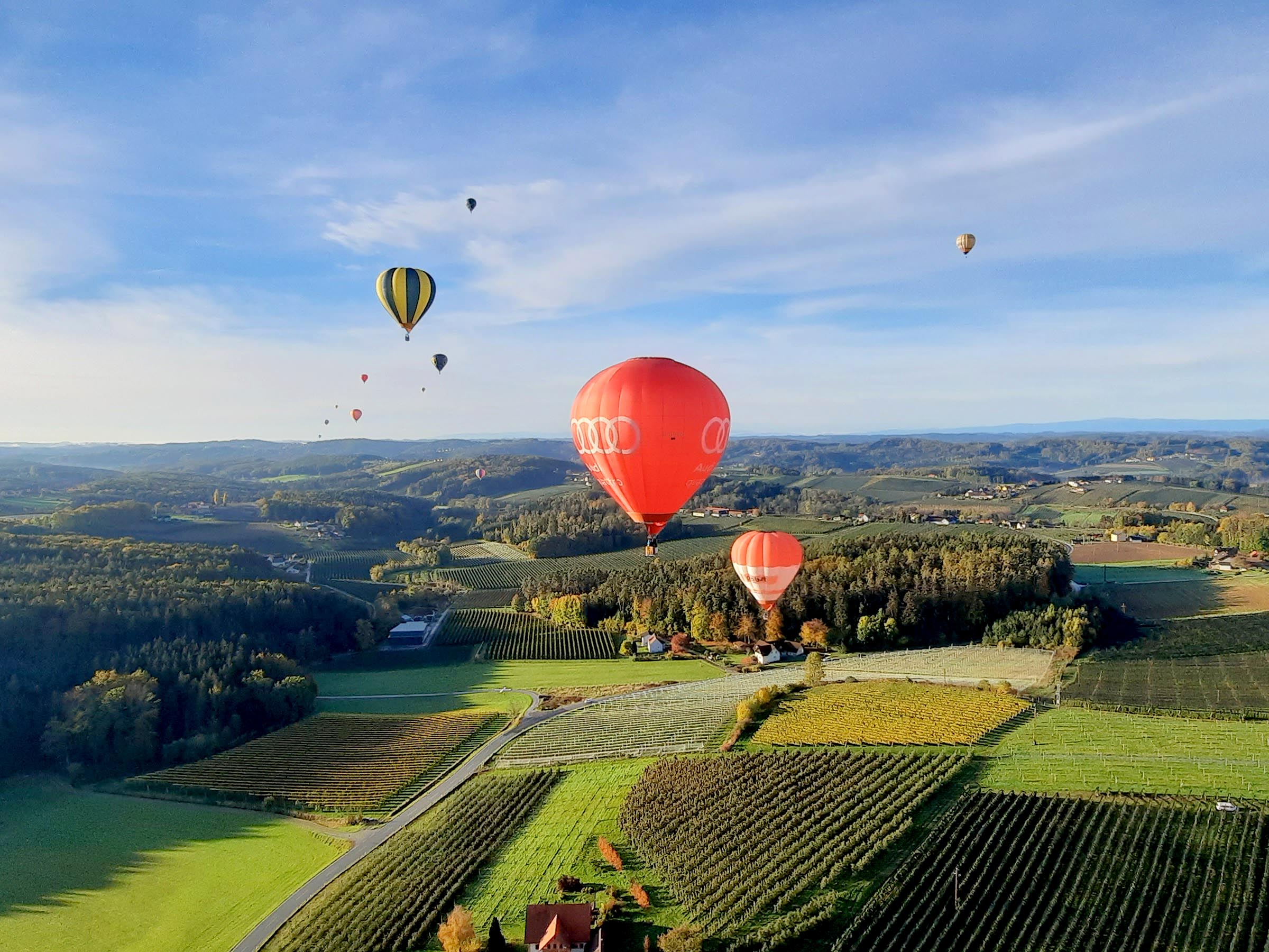 Bei der Apfelmontgolfiade im Oktober zieren bunte Heißluftballone den Himmel über Puch.